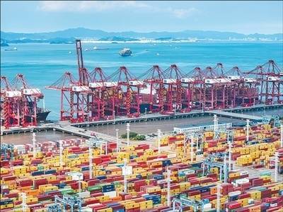在浙江宁波舟山港大榭港区,五彩缤纷的集装箱整齐堆放在海岸,远洋货船往来不断,在海面划出一道道航迹……